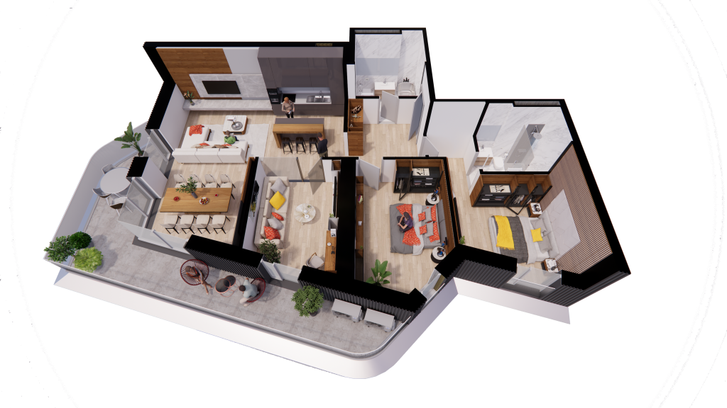 - Un living aerisit cu bucătărie open-space, locul ideal pentru momente petrecute în familie