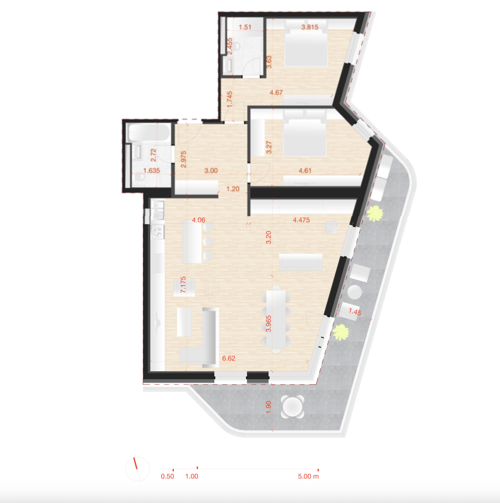 Apartamentul are 100 mp utili, este situat la etajul 5 și beneficiază de ferestre ample ce deschid perspective largi către natură și ritmul orașului. Spațiul este inteligent configurat și include: