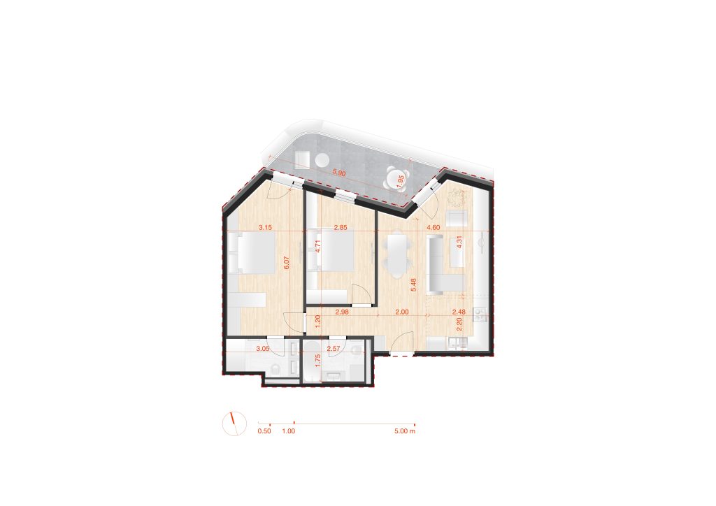 The apartment has 72 usable square meters, is located on the 2nd floor, and features large windows that open wide perspectives toward nature and the city’s rhythm. The space is intelligently configured and includes: